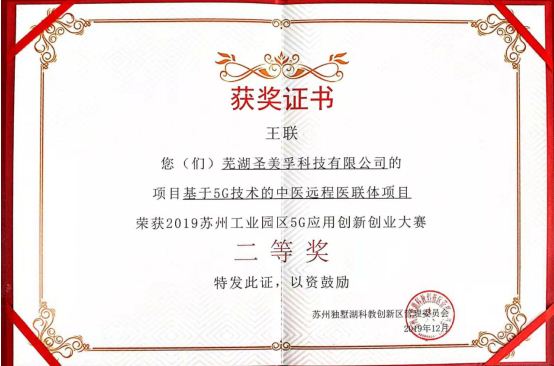 蕪湖圣美孚科技公司以“基于5G技術(shù)的中醫(yī)遠(yuǎn)程醫(yī)聯(lián)體項(xiàng)目”參加此次大賽,與參賽的各種人工智能、大數(shù)據(jù)和物聯(lián)網(wǎng)等5G示范應(yīng)用場(chǎng)景的高新科技項(xiàng)目同臺(tái)亮相,于決賽現(xiàn)場(chǎng)進(jìn)行了路演,闡述了基于5G技術(shù)的中醫(yī)遠(yuǎn)程醫(yī)聯(lián)體項(xiàng)目成果并接受大賽評(píng)委的評(píng)審問(wèn)答,經(jīng)過(guò)一番角逐,我公司參賽的“基于5G技術(shù)的中醫(yī)遠(yuǎn)程醫(yī)聯(lián)體項(xiàng)目”榮獲2019年蘇州工業(yè)園區(qū)5G應(yīng)用創(chuàng)新創(chuàng)業(yè)大賽二等獎(jiǎng)。